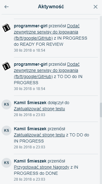 Widać go zawsze po prawej stronie tablicy. Jest to historia statusów i pokazuje co kto zmienił: