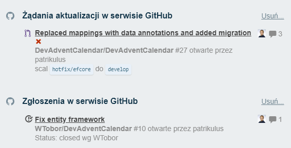 Do tablicy w Trello można dołączyć dodatki takie jak np. GitHub. Wtedy w widoku ogólnym zadania będzie widać historię aktualizacji w serwisie GitHub.