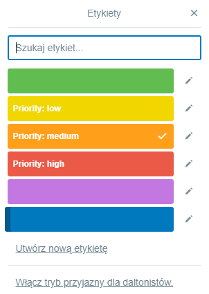 Utworzyłam etykiety dotyczące np. priority danego zadania: High, Medium i Low.