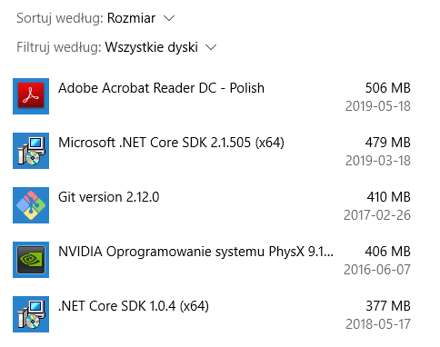 Czas wytoczyć cięższe działa. A nazywają się one „Dodaj lub usuń programy”. Warto posortować programy według rozmiaru i wtedy co nieco może się wyklarować.