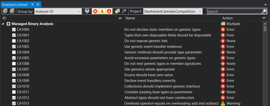 Po rozwinięciu widać różne zasady włączone lub wyłączone, z określeniem ich akcji (None, Warning lub Error), które można edytować: