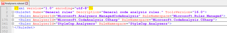 Do konfiguracji potrzebny jest plik o rozszerzeniu .ruleset. Warto stworzyć taki na potrzeby solucji i dodawać ścieżkę do niego w pliku .csproj: