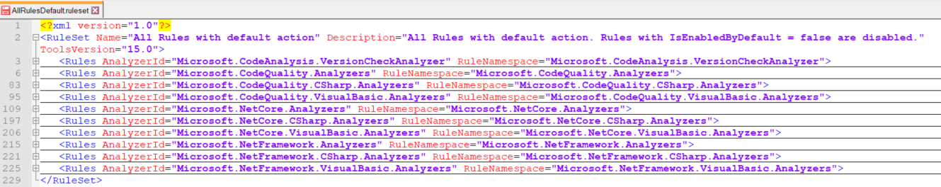 Po otwarciu pliku o rozszerzeniu .ruleset w Visual Studio 2019 otwiera się specjalny widok: