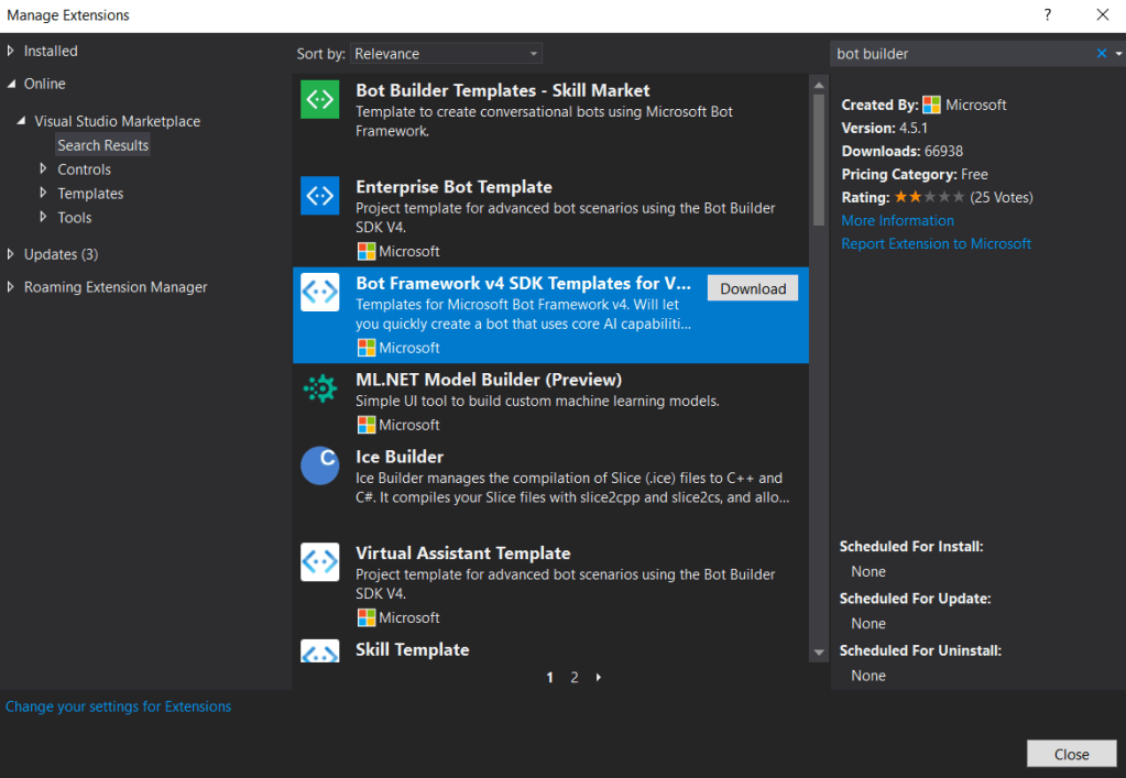 Na początku należy zainstalować odpowiednie SDK, więc wystarczy w Visual Studio (na przykładzie Visual Studio 2019) wejść w Extensions -> Manage Extensions i z listy Online wyszukać „Bot Framework v4 SDK Templates” (można też zrobić to osobno, pobierając paczkę pod linkiem).