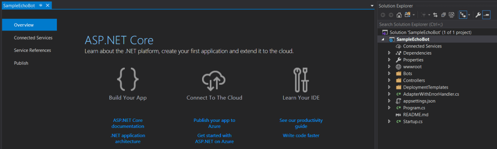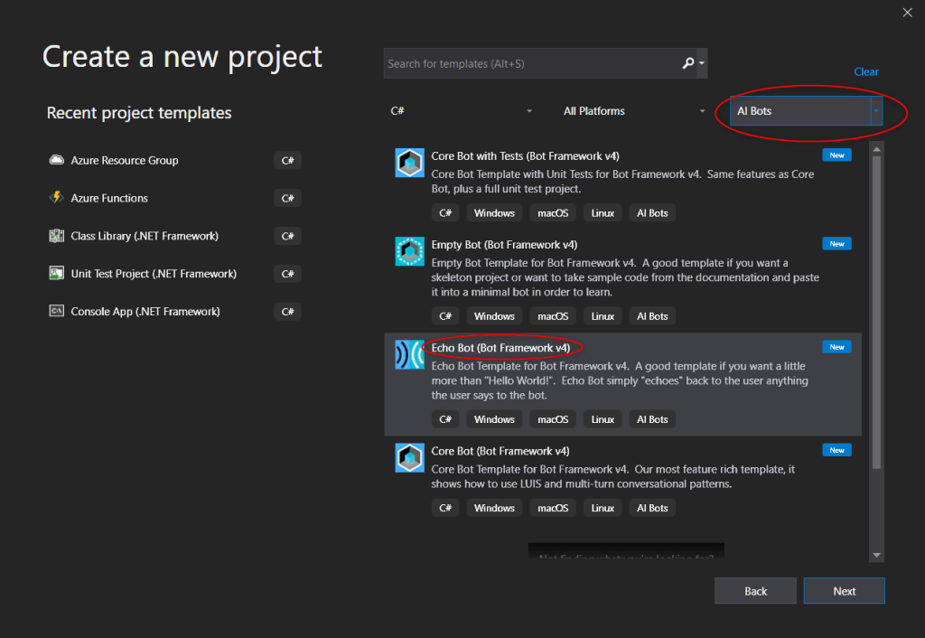 Następnie możemy utworzyć nowy projekt i przy wyborze wybrać najprostszego Echo bota (będzie odpowiadał to, co się do niego napisze).