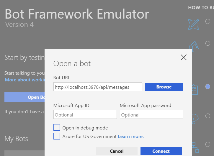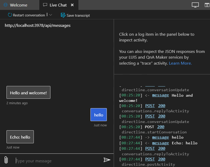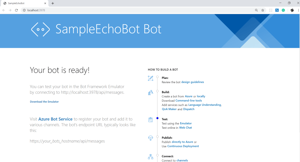 To znaczy, że API naszego bota działa i jest dostępne pod localhost:3978/api/messages.