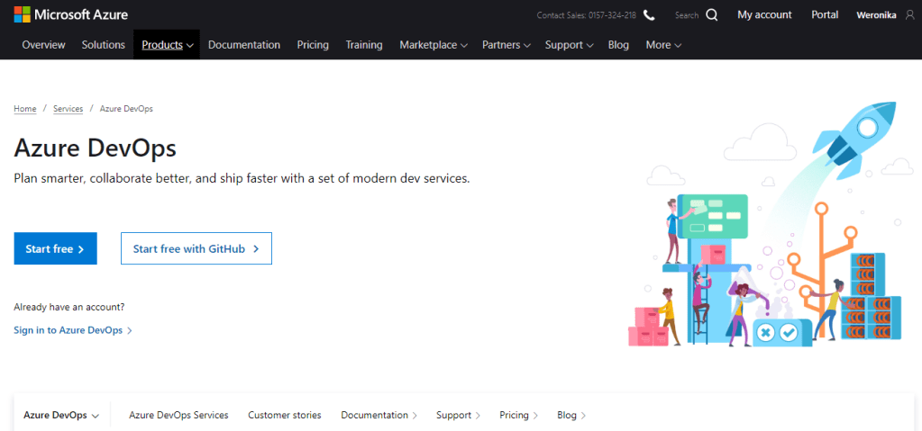 Na początek wejdźmy na stronę https://azure.microsoft.com/en-us/services/devops/