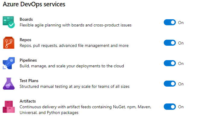 Poniżej jest lista zakładek, które chcemy mieć dostępne na Azure DevOps dla tego projektu. My mamy włączone wszystkie.