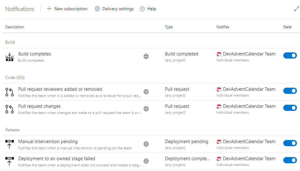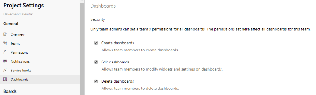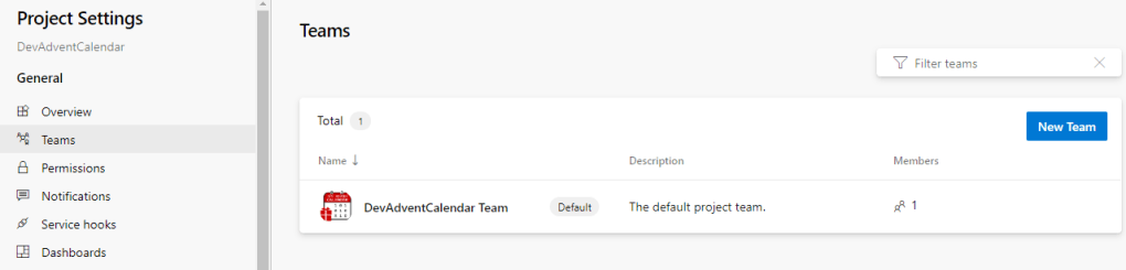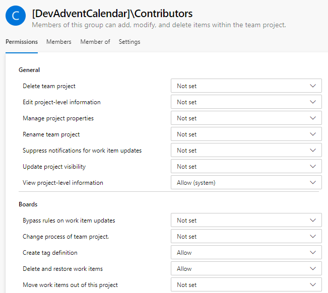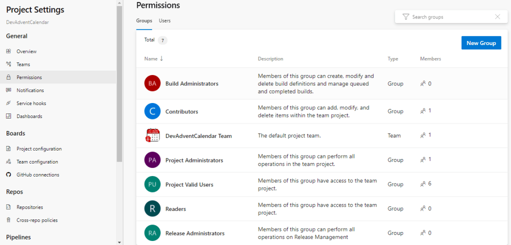 Uprawnienia, czyli lista grup z określonymi uprawnieniami. Jak widać należę do grupy Contributors, DevAdventCalendar Team (domyślnego zespołu) oraz Project Administrators (pełne uprawnienia)