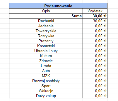 Wszystkie paragony po kolei uzupełniam w innej tabeli, w której oznaczam również kategorię wydatku. Robię to albo systematycznie po każdych zakupach, albo raz w tygodniu lub nawet raz w miesiącu. Tabelka przedstawiona na obrazku sumuje wszystkie wydatki z każdej kategorii.