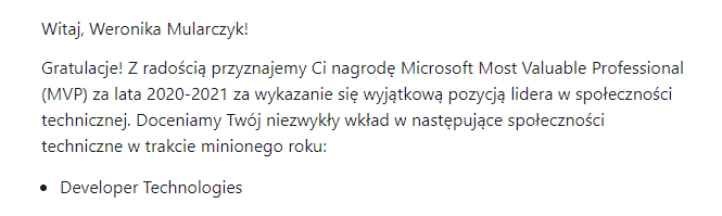 8 kwietnia 2020 dostałam wiadomość od znajomej Joanny Lamch. Spotkałyśmy się przelotnie na kilku wydarzeniach, kojarzymy się z Internetów. Ostatni raz widziałyśmy się na spotkaniu Wrocławskiej grupy .NET, gdzie ja wchodziłam w skład organizatorów, a Asia była prelegentką. Zamieniłyśmy wtedy parę słów. Jakiś czas później Asia została MVP. Możecie więc wyobrazić sobie moje zdziwienie, gdy 8 kwietnia Asia napisała do mnie, że chciałaby zgłosić mają kandydaturę jako MVP. Byłam w totalnym szoku. Ale skoro jest ktoś, kto myśli, że mogę spełniać wymagania – to czemu nie. Zgodziłam się.