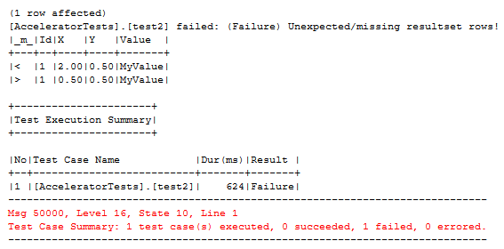 Znak < wskazuje otrzymany rekord z tabeli #Actual, a znak > rekord przewidywany z tabeli #Expected. Widać, że różnią się wartością w kolumnie X.