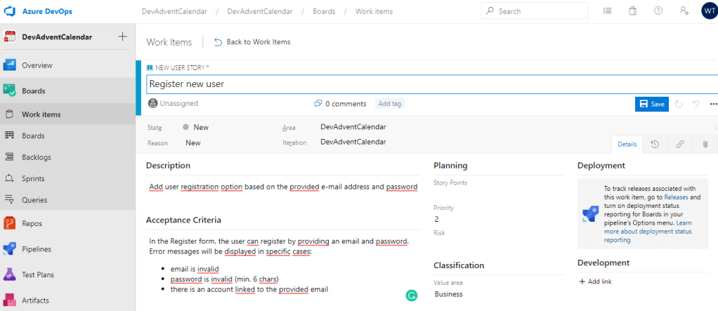 Wypełniamy odpowiednio tytuł oraz opis, a także Acceptance Criteria. Podczas planowania można ustawić odpowiednią liczbę Story Points – nie będziemy jednak zajmować się tym w bieżącym wpisie. W celu zapisania Work Item wystarczy kliknąć przycisk Save w prawym górnym rogu.