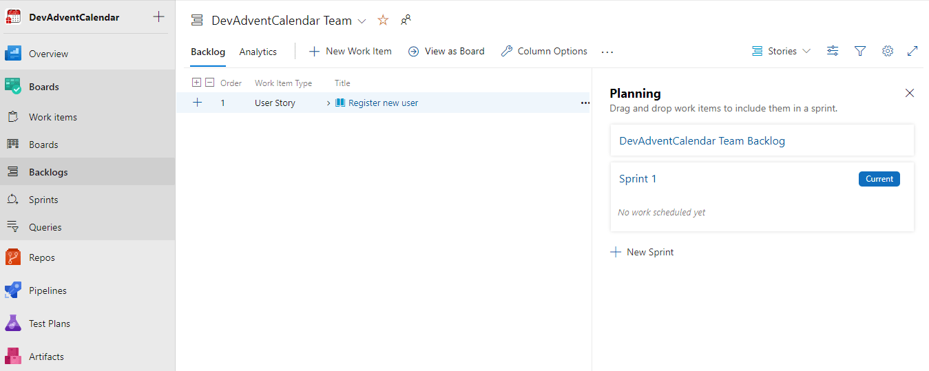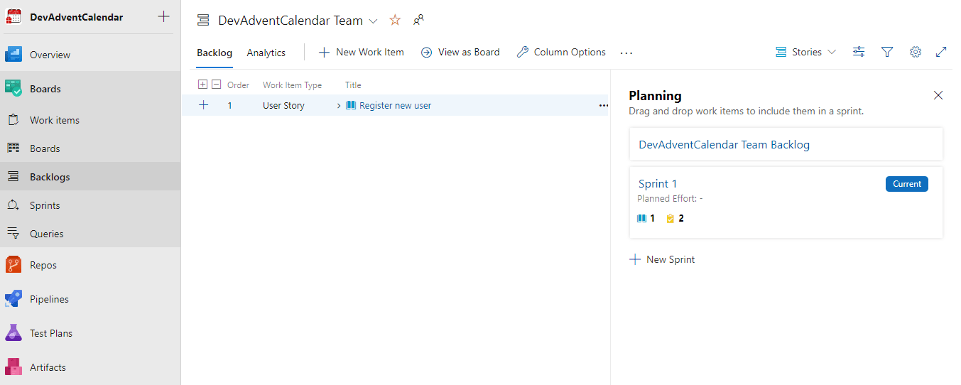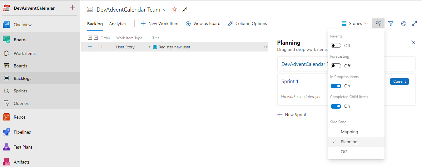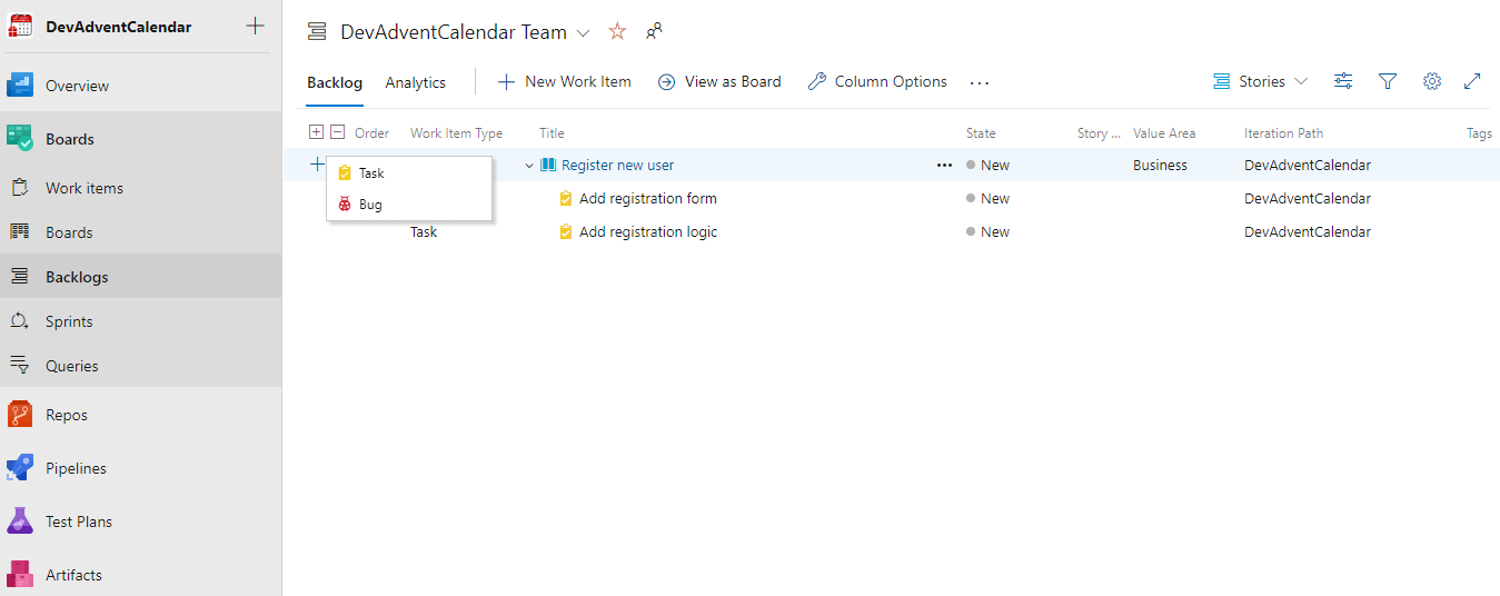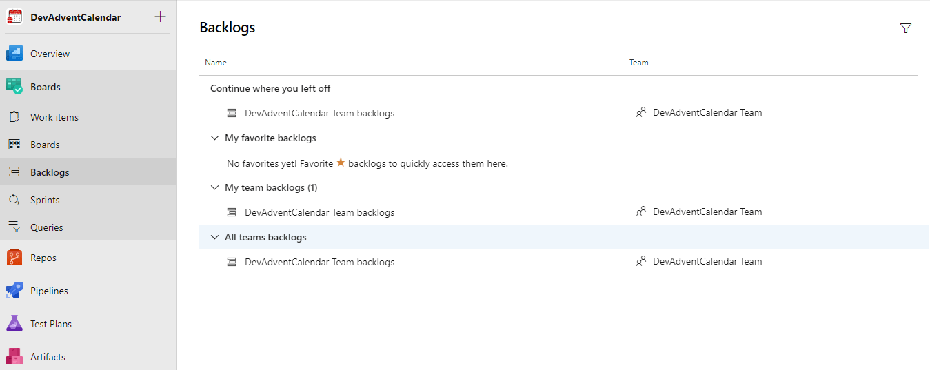 Możemy mieć zdefiniowanych kilka różnych Backlogs. W tym momencie mamy tylko jeden, domyślny, więc wybieramy DevAdventCalendar Team backlogs: