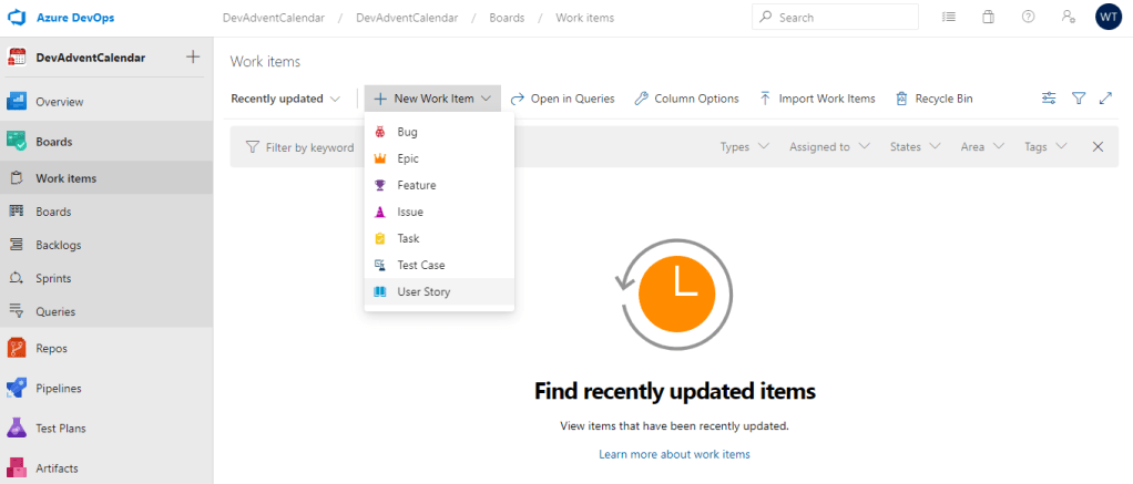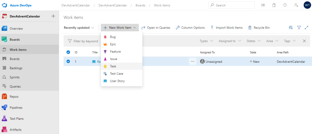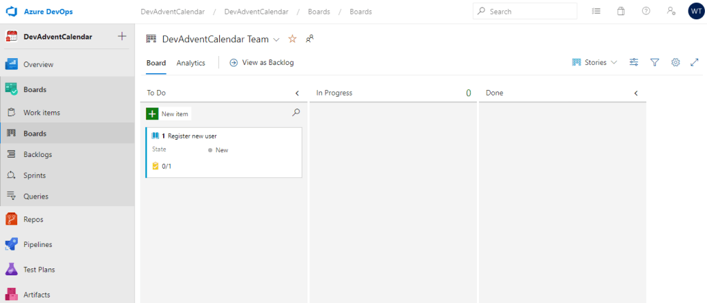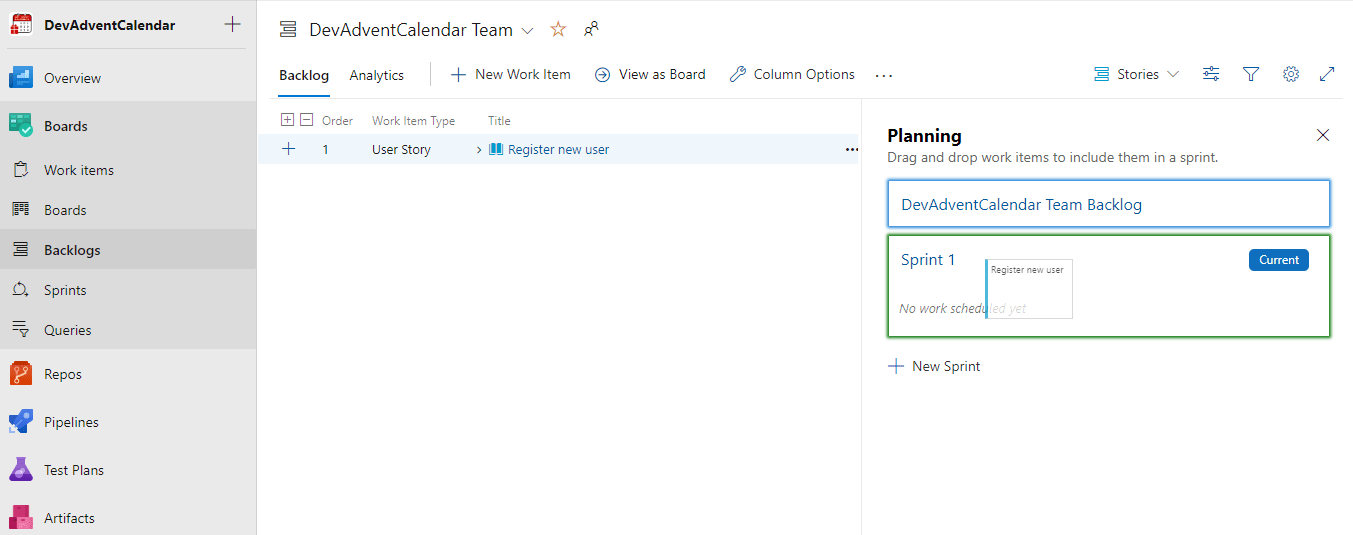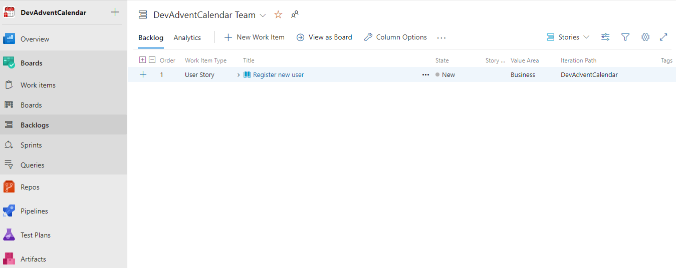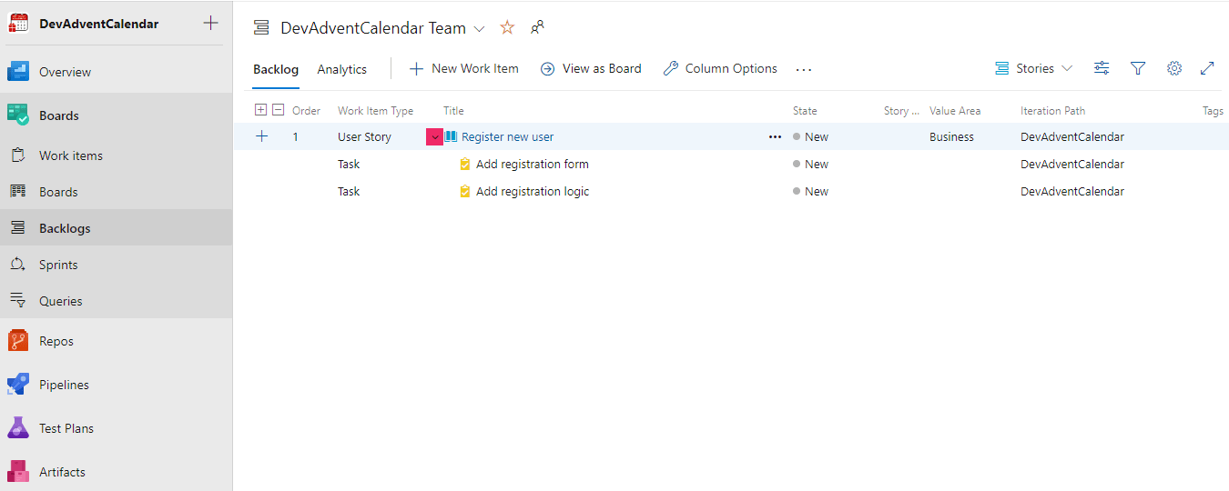 Możemy mieć zdefiniowanych kilka różnych Backlogs. W tym momencie mamy tylko jeden, domyślny, więc wybieramy DevAdventCalendar Team backlogs: