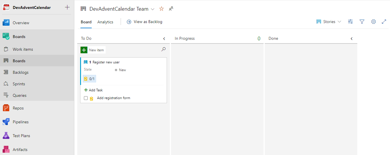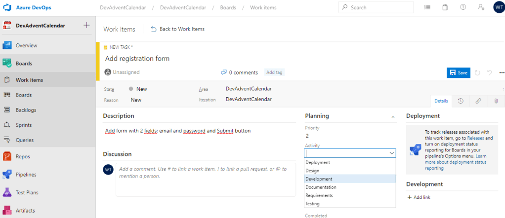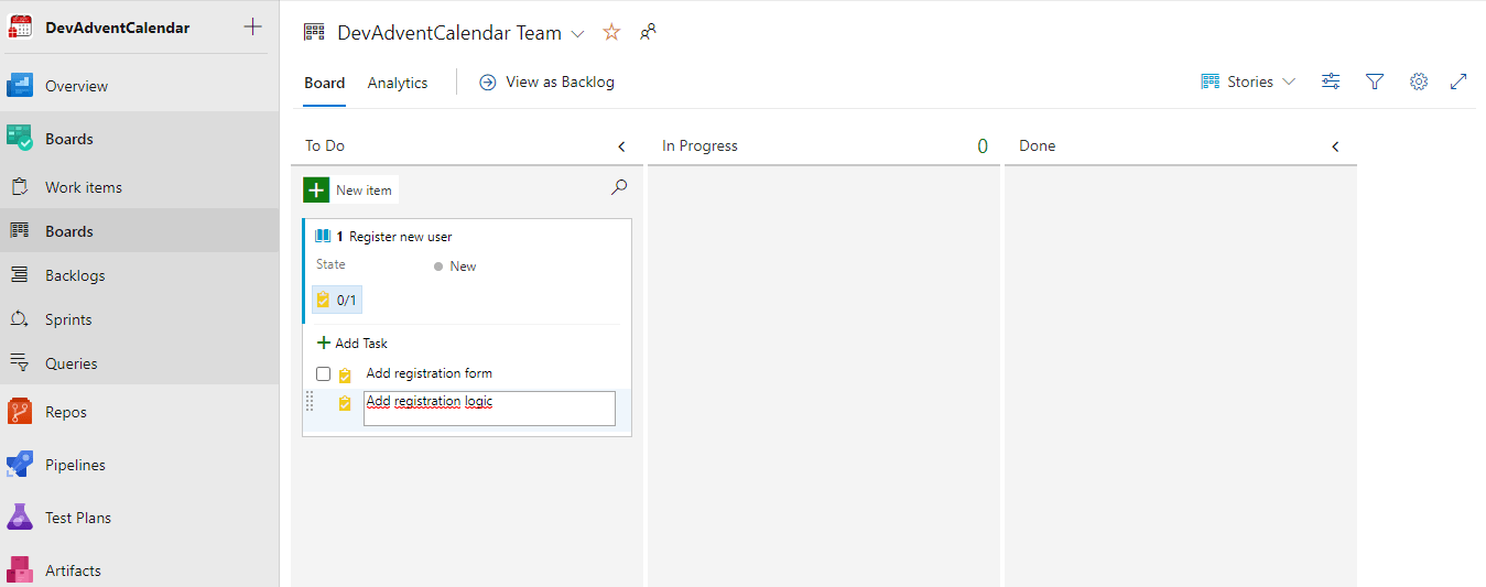 User Story jest dodane, czas dodać jakieś zadania (Work Item Type = Task).