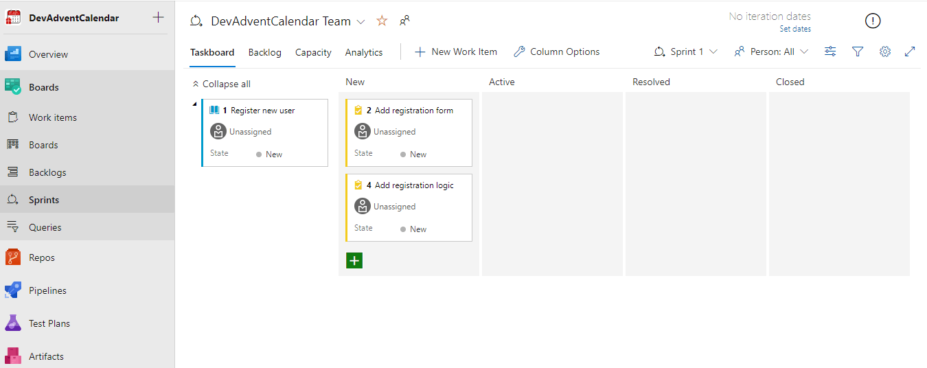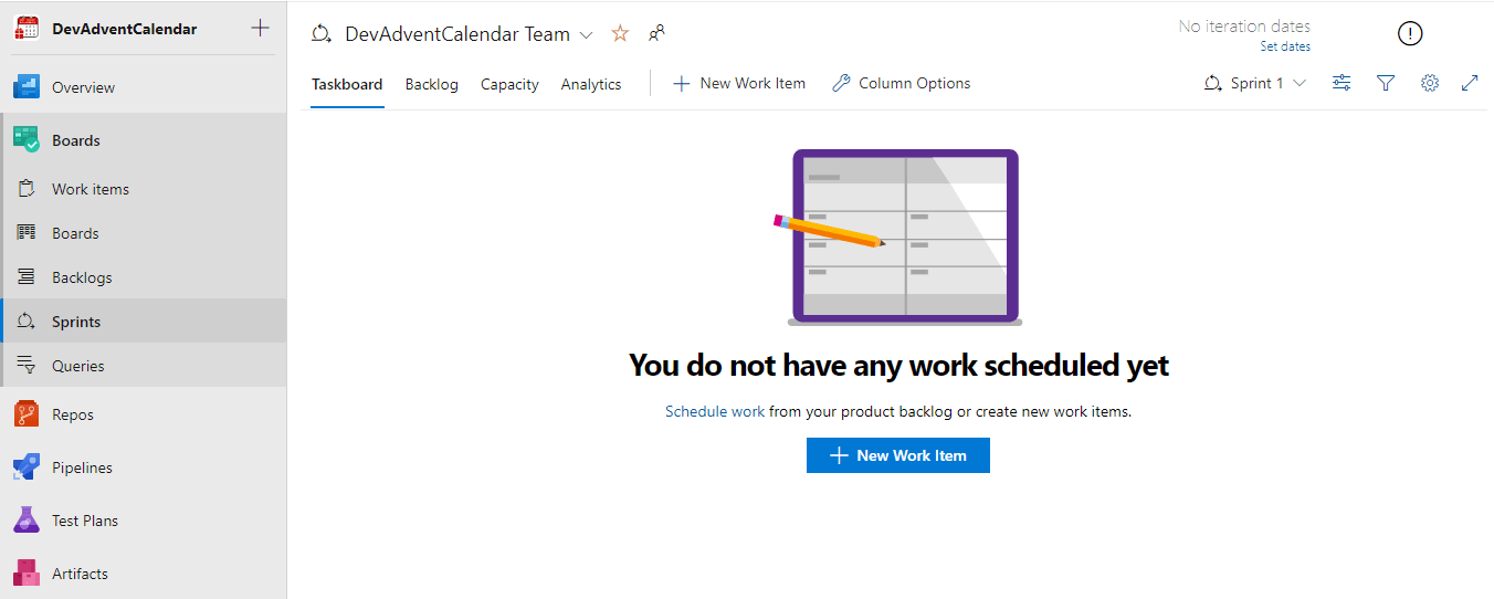 Aktualnie nie mamy zadeklarowanej pracy na aktualny Sprint/iterację (niezdefiniowany okres czasowy – widać w prawym górnych rogu opcję Set dates do ustalenia długości jego trwania).