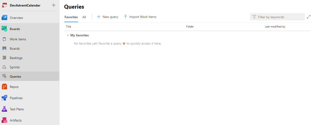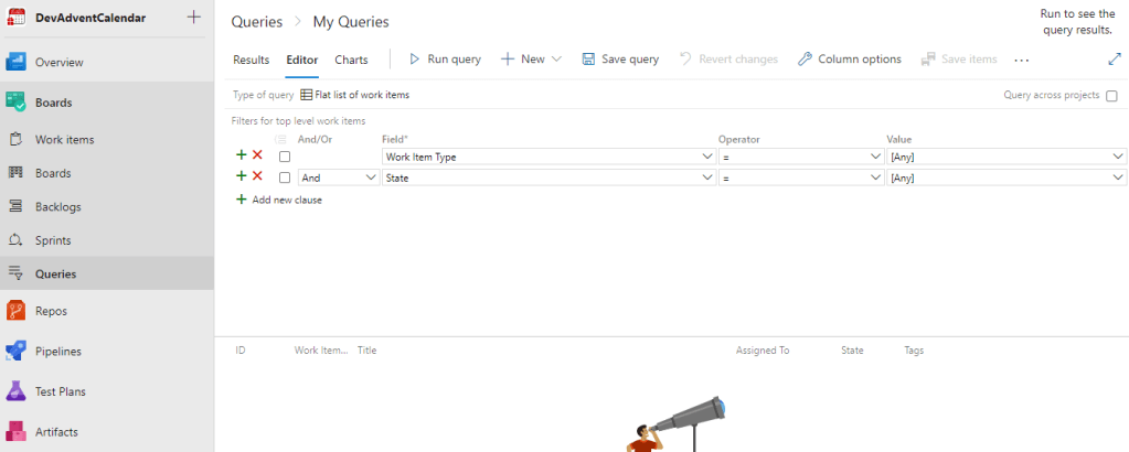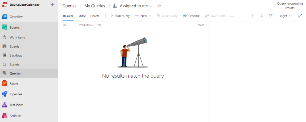 Domyślnie zostanie wyświetlone testowe query zwracające wszystkie Work Items: