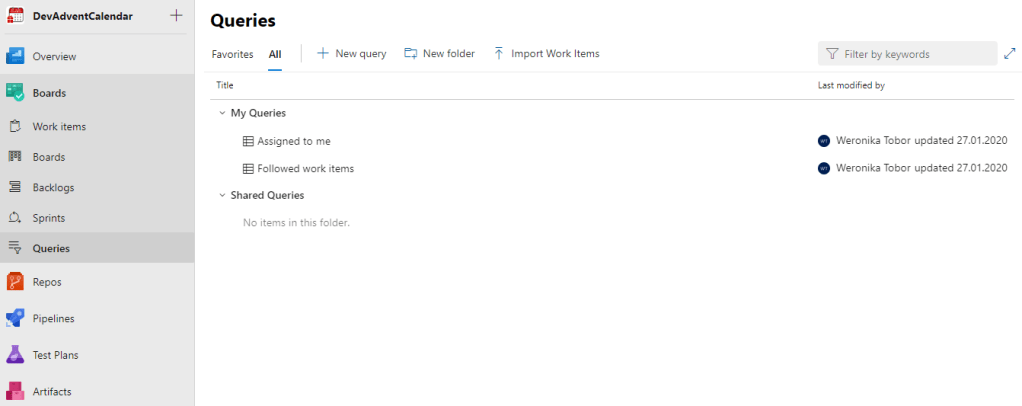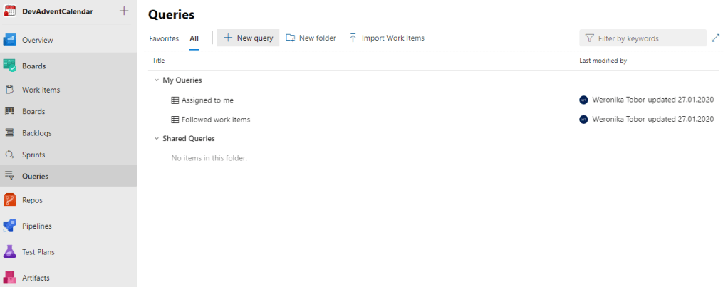 Queries to nic innego jak możliwość pisania własnych zapytań zwracających np. listę bugów, listę tasków czy Work Items, do których dana osoba jest przypisana.