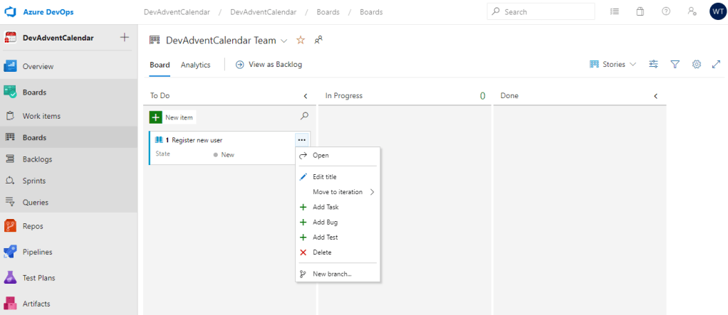 W tej zakładce widzimy podział Work Items na kolumny: To Do, In Progress oraz Done. Jak widać, można wybrać z menu opcję dodania np. Taska do konkretnego User Story.