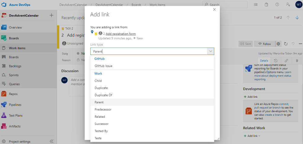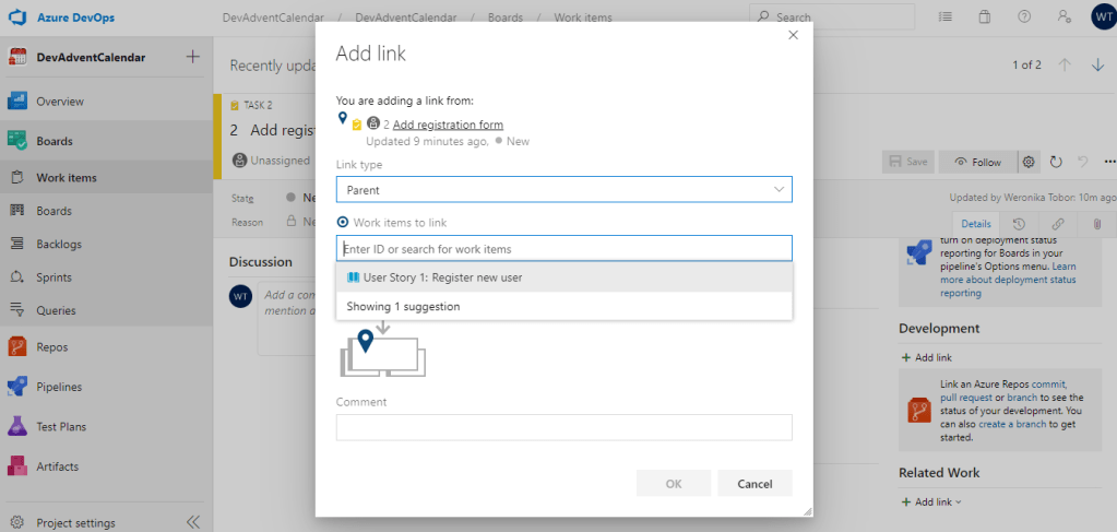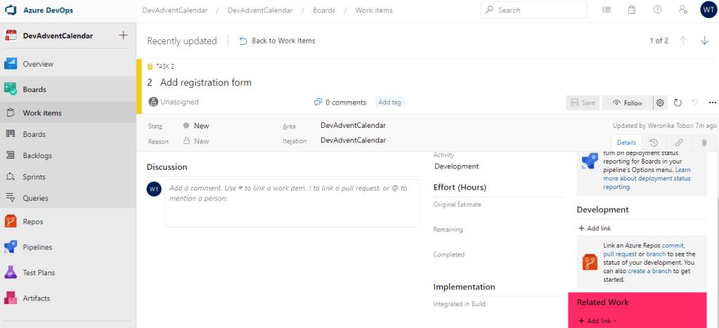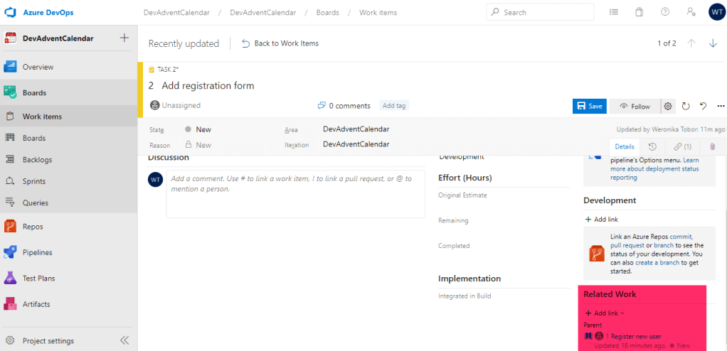 Wróćmy do sekcji Work Items i edytujmy nasz Task. To, czego jeszcze nie zrobiliśmy, to „podpięcie” go pod konkretne User Story. Służy temu część Related Work (prawy dolny róg):