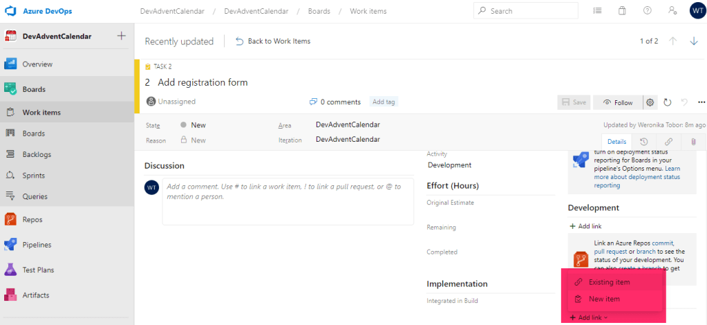 Możemy wybrać istniejący Work Item, albo nowy. Utworzyliśmy już wcześniej User Story, więc wybieramy opcję Existing Item: