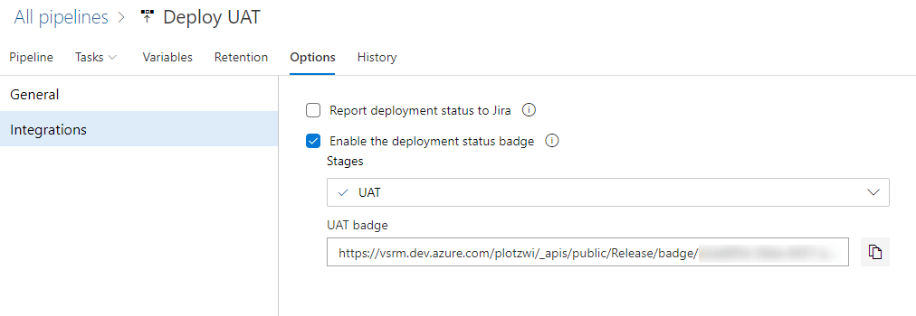 W zakładce Integrations należy zaznaczyć checkbox „Enable the deployment status badge„. Wtedy wyświetli się konkretny link do badge, który można wstawić do naszej dokumentacji.