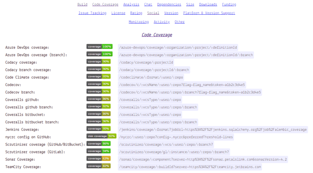 Każda kategoria badge na shields.io umożliwia integrację z wieloma różnymi serwisami. Przykładowo wartość Code Coverage można pobrać zarówno z Azure DevOps, TeamCity, Sonar, Jenkins czy Codecov i innych: