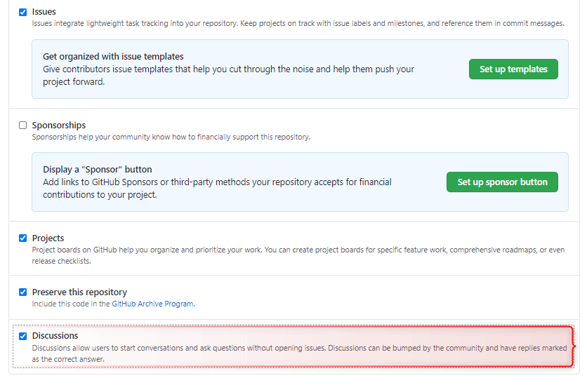 Discussions to nowa zakładka dla projektu, w której można prowadzić różnego rodzaju dyskusje. Na razie jest to Beta, do której można się zgłosić np. na tej stronie. Później wystarczy włączyć funkcję dla danego repozytorium